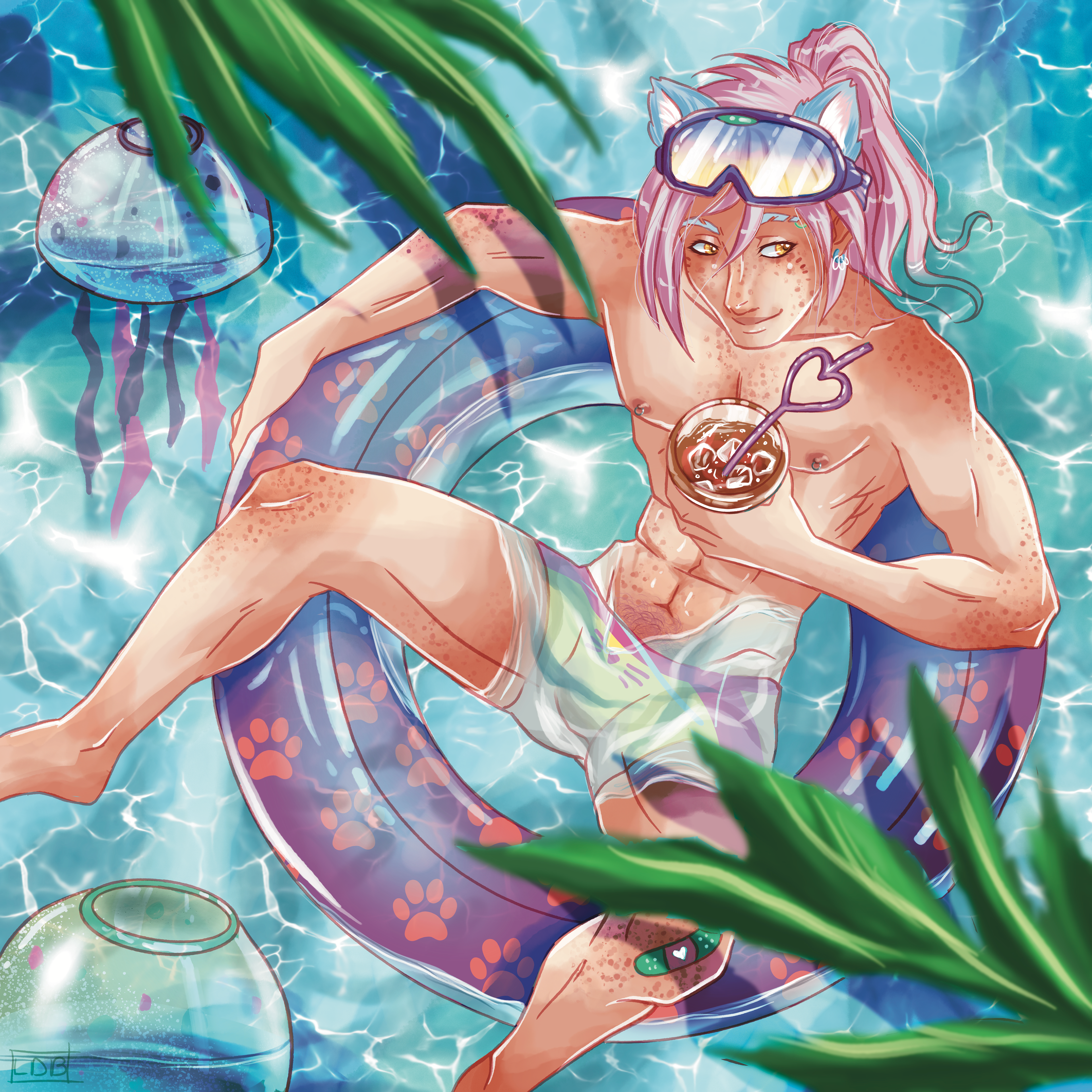 Wren kickin' it in a pool tube with some pool toys. Procreate.